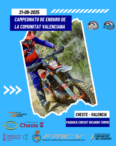 CAMPEONATO COMUNIDAD VALENCIANA VI Enduro de Cheste 21.09.25 Información Lista de inscritos Orden de salida Horarios controles Clasificaciones Crono Tramo Categoriás